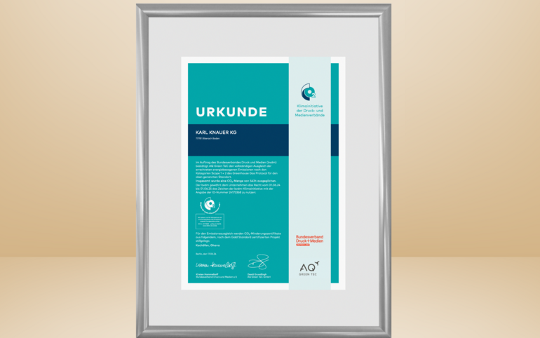 Through the continuous support of such projects, Karl Knauer remains an active member of the Climate Initiative of the German Printing and Media Industries Federation (bvdm) and sets a strong example for climate-neutral production.