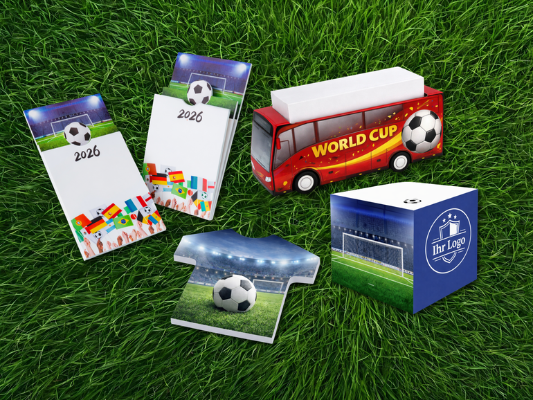 Karl Knauer offers creative standard items that can be individually designed in your corporate design. Shaped adhesive notes made from FSC-certified material – round like a ball, as a jersey, a thumbs up or a heart – add a sporty touch to your desk. Printed in 4/0-colour Euroscale offset printing and available from 500 pieces, they are ideal as mailing enhancers, trade fair giveaways or inserts for campaigns related to the tournament.