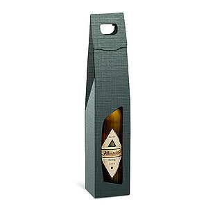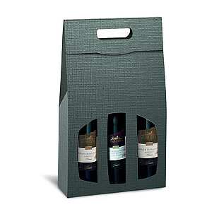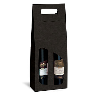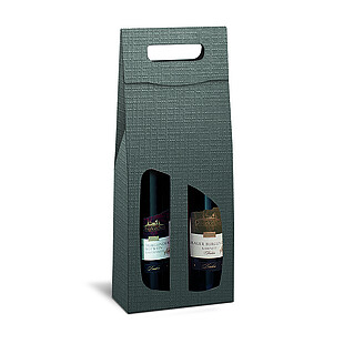 Carrying box with textured surface for wine and champagne bottles, coloured black inside, with extra-long viewing windows and carrying handle.