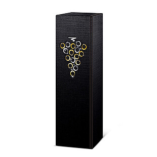 Wine gift carton with wood look and innovative real wood feel, with accurately copied details, coloured black on the inside, with black inlay, mailable with matching outer boxes