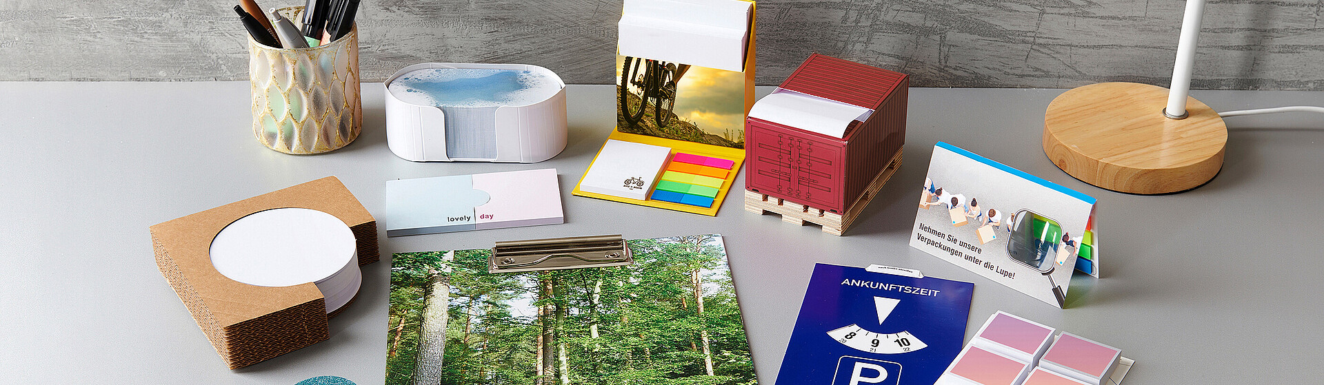 We also offer our popular adhesive products with special structural designs. Whatever you would like in terms of materials, finishes, shapes, sizes and numbers of sheets – almost anything can be created. Product imitations or effect envelopes are particularly effective, for example. Various adhesive products such as adhesive notes and adhesive markers can also be combined with the likes of note pads.